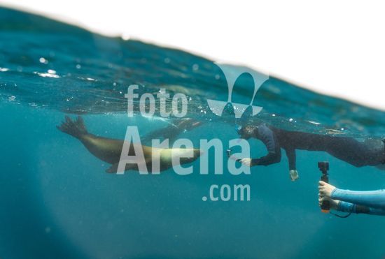 STANDALONE PHOTO FOR USE AS DESIRED WITH YEAREND STORIES -- Tourists swim with a sea lion in the waters off Floreana Island, in Ecuador?s Galapagos Archipelago, on Aug. 27, 2025. The islands that Darwin made famous have become more accessible. Too accessible, say some locals and researchers, who fear nature is imperiled. (Todd Heisler/The New York Times/Fotoarena)