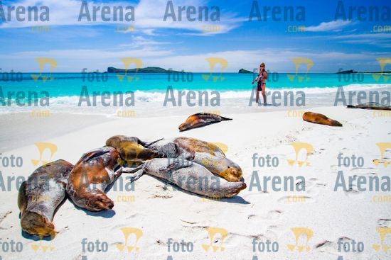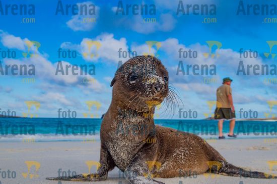 1112-10067 Guest with Galapagos sea lion pup (Zalophus wollebaeki) on Gardner Beach, Espanola Island in the Galapagos, UNESCO World Heritage Site, Ecuador, South AmericaLegenda da Fotoarena:Guest with Galapagos sea lion pup (Zalophus wollebaeki) on Gardner Beach, Espanola Island in the Galapagos, UNESCO World Heritage Site, Ecuador, South America