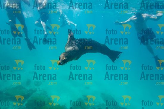 1112-10082 Snorkelers with Galapagos sea lion (Zalophus wollebaeki) underwater in the Galapagos Island Archipelago, UNESCO World Heritage Site, Ecuador, South AmericaLegenda da Fotoarena:Snorkelers with Galapagos sea lion (Zalophus wollebaeki) underwater in the Galapagos Island Archipelago, UNESCO World Heritage Site, Ecuador, South America