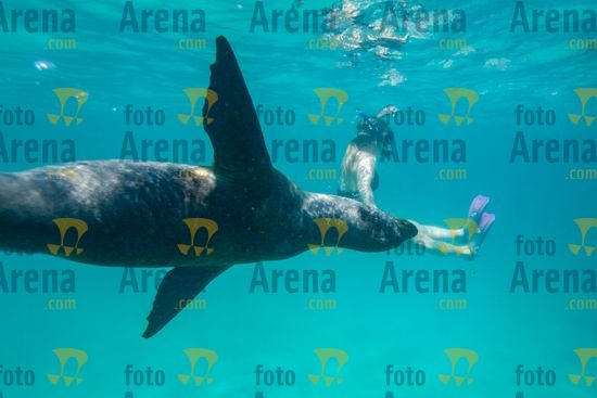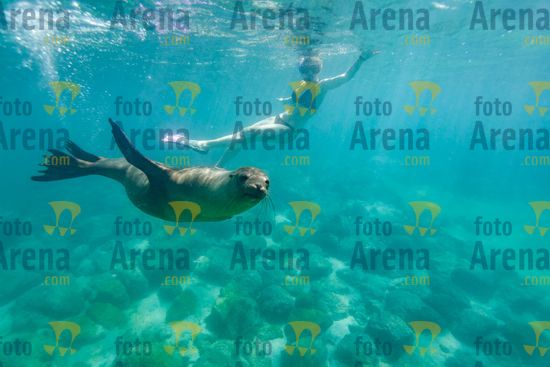 1112-10083 Snorkeler with Galapagos sea lion (Zalophus wollebaeki) underwater in the Galapagos Island Archipelago, UNESCO World Heritage Site, Ecuador, South AmericaLegenda da Fotoarena:Snorkeler with Galapagos sea lion (Zalophus wollebaeki) underwater in the Galapagos Island Archipelago, UNESCO World Heritage Site, Ecuador, South America