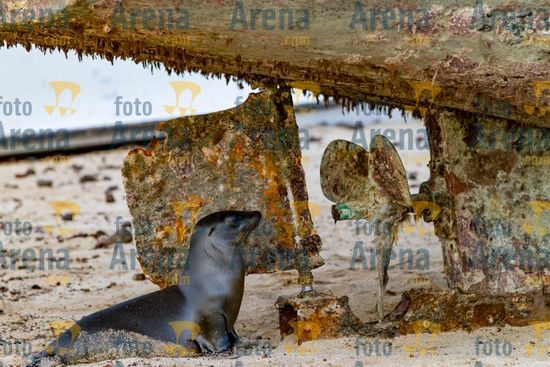 1112-10096 Galapagos sea lion (Zalophus wollebaeki) pup inspects a fishing boat on the beach on San Cristobal Island, Galapagos, UNESCO World Heritage Site, Ecuador, South AmericaLegenda da Fotoarena:Galapagos sea lion (Zalophus wollebaeki) pup inspects a fishing boat on the beach on San Cristobal Island, Galapagos, UNESCO World Heritage Site, Ecuador, South America