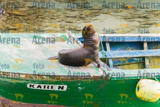 1112-10099 Galapagos sea lion (Zalophus wollebaeki) pup takes over a small fishing boat on Isabela Island, Galapagos Islands, UNESCO World Heritage Site, Ecuador, South AmericaLegenda da Fotoarena:Galapagos sea lion (Zalophus wollebaeki) pup takes over a small fishing boat on Isabela Island, Galapagos Islands, UNESCO World Heritage Site, Ecuador, South America