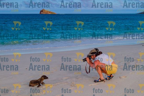 1112-11036 Tourist photographing a Galapagos sea lion (Zalophus wollebaeki) pup in the Galapagos Island Archipelago, UNESCO World Heritage Site, Ecuador, South AmericaLegenda da Fotoarena:Tourist photographing a Galapagos sea lion (Zalophus wollebaeki) pup in the Galapagos Island Archipelago, UNESCO World Heritage Site, Ecuador, South America