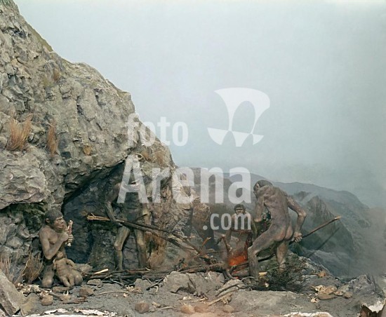 akg027901 Pre and early history:. Glacial period. Primitive men by the fire (Neanderthal period, late intermediate Glacial period, 70000 - 40000 BC). Diorama. Hanover, State Museum of Lower Saxony. Museum: Hannover, Niedersächsisches Landesmuseum.