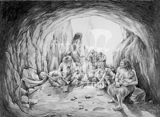 akg291715 Pre-and Early History. Neanderthal men (Homo neanderthalensis) in a cave (Palaeolithic age, c. 35 000 years ago). Drawing, 2001, by Johann Brandstetter. (born 1959). Pencil on paper, 29.5 × 37cm. Possession of the artist. Copyright: Artistic copyright in this image is automatically cleared via akg-images.