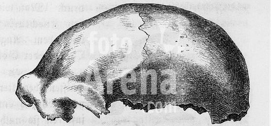 akg182208 Vor- und Frühgeschichte:. Stammesgeschichte des Menschen. "Oberschädel des fossilen Menschen aus dem diluvialen Lehm der Neanderhöhle bei Düsseldorf". Holzstich aus: Friedrich Rolle, Der Mensch, seine Abstammung und Gesittung im Lichte der Darwin'schen Lehre. 2. Ausg., Prag (F.Tempsky) 1870, S. 309.