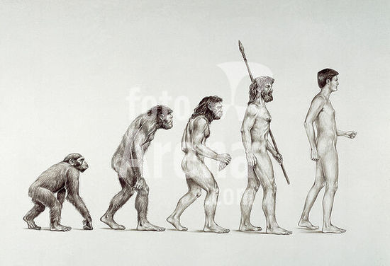 akg239663 Anthropology:. History of Man. Evolution from ape to Homo erectus, Homo neanderthalensis to Homo sapiens. Drawing, 1998, by Johann Brandstetter. (born 1959). Owned by the artist. Copyright: Artistic copyright in this image is automatically cleared via akg-images.