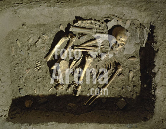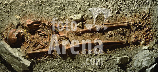 les03030353 Burial chamber with skelleton of a young Neanderthal prince from the grotto of " Arene candide" near Finale Ligure, Italy. Upper Palaeolithic. Location: Anthropological Institute, Turin, Italy.