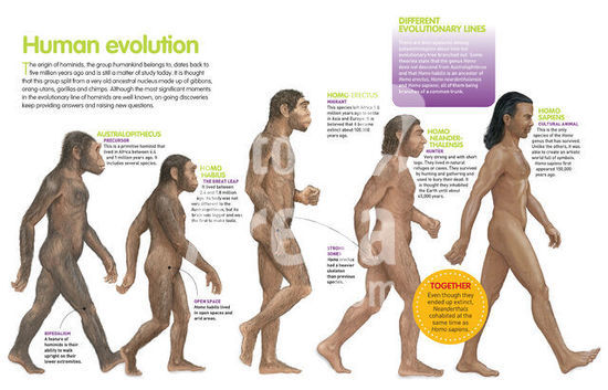 alb2267945 Computer graphics about the evolution of Humankind from Australopithecus to Homo Sapiens (from 4 million years to 150,000 ago). [Adobe InDesign (.indd); 4960x3188].