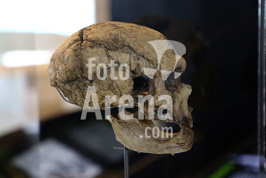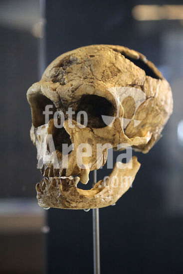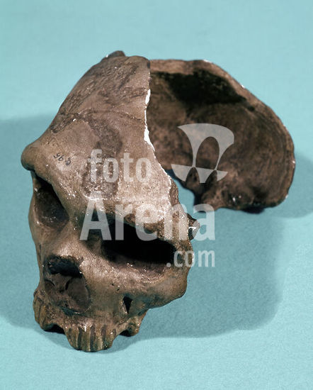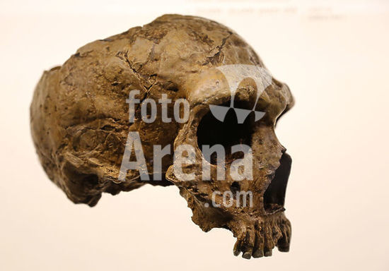 alb2103914 PIECES OF THE EXHIBITION "ART WITHOUT ARTISTS": REPLICA OF SKULL AND JAW OF HOMO NEANDERTHALENSIS. ORIGINAL OF THE CAVE OF FERRASSIE, (FRANCE), 120000 YEARS.