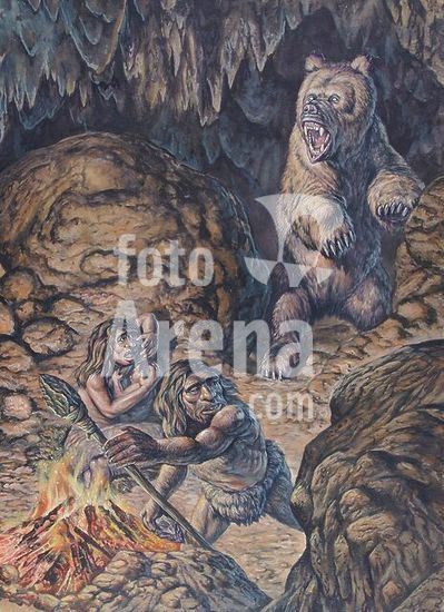 alb3876357 Homo neanderthalensis (Neanderthal humans) confronted by a cave bear (Ursus spelaeus), Pleistocene Epoch (Ice Age) of Europe and Western Asia.