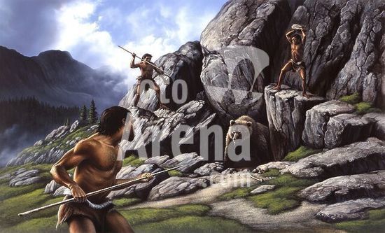 alb3882979 Neanderthals hunt a cave bear.