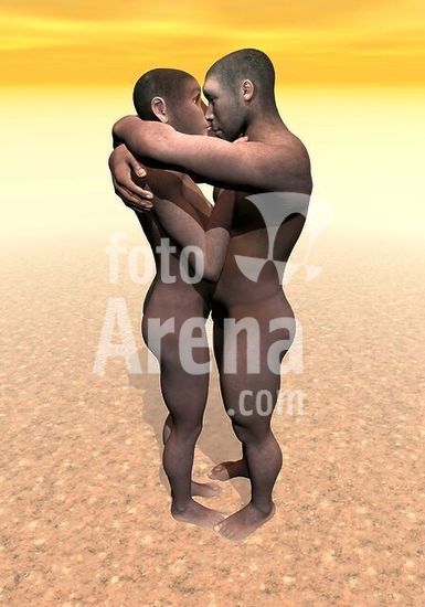 alb3883182 Male and female Homo erectus hugging in the desert.