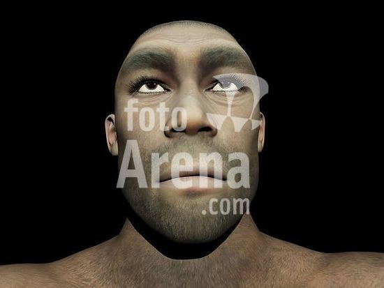 alb3885009 Portrait of a male Homo Erectus, prehistoric ancestor that lived around 1.8 million years ago, black background.