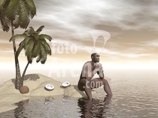 alb3885584 Male Homo Erectus sitting alone on a beach island next to coconuts while thinking.