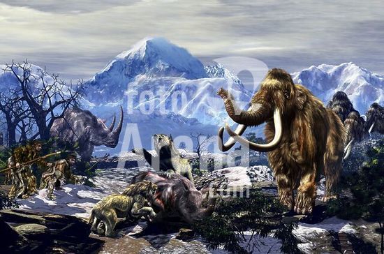alb3885974 Two Neanderthals aproaching a group of Machairodontinae feeding on a Woolly Rhinoceros with a group of Woolly Mammoths on the far end.