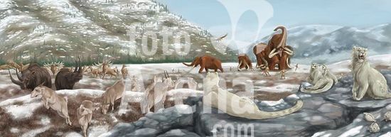 alb3886530 British landscape, 350,000 pb. Includes from left; Woolly rhino, Megaloceros (Irish Elk), Saiga antelope, Woolly Mammoth (Mammuthus primigenius), Homo neanderthalensis, Cave lion, Arctic lemming.