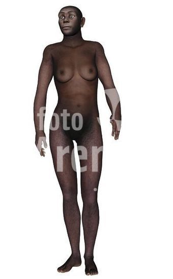 alb3887440 Female homo erectus standing, white background.