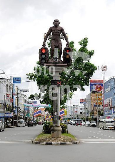 iblpkp02357664 Caveman sculpture holding traffic lights, Krabi Town, Krabi, Thailand, Asia