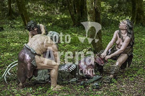 ibltsm09601637 Diorama showing Neanderthal hunters skinning deer in forest at Prehisto Parc, theme park about prehistoric life at Tursac, Périgord, Dordogne, France, Europe