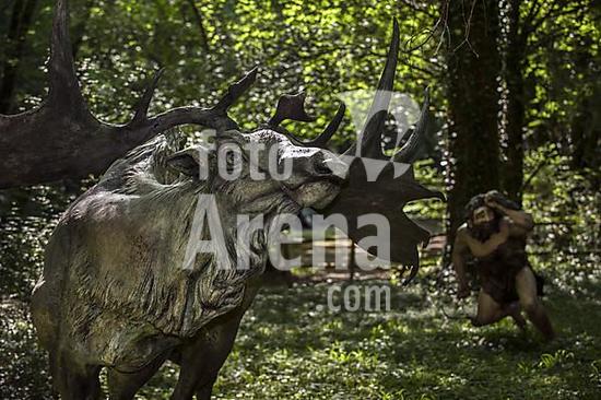 ibltsm09601639 Diorama showing Neanderthal hunter chasing Irish elk (Megaloceros giganteus) at Prehisto Parc, theme park about prehistoric life at Tursac, Périgord, Dordogne, France, Europe