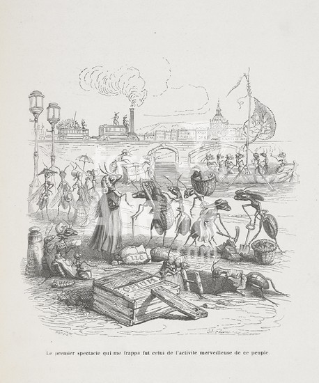 alb4056305 Le premier spectacle qui me frappa fut celui de l'activite merveilleuse de ce peuple. Anthropomorphic image of ants unloading items on a riverbank. A crate containing opium can be seen. Peines de cœur d'une chatte anglaise.-Guide-âne à l'usage des animaux qui veulent parvenir aux honneurs.-Voyage d'un lion d'Afrique à Paris.-Les Amours de deux bêtes. In: Stahl (P. J.) pseud. Scènes de la vie privée des animaux ... Études de mœurs contemporaines publiées sous la direction de M. P. J. Stahl, avec la collaboration de Messieurs de Balzac, L. Baude, etc. 1842. Source: 1457.k.1 plate opposite page 235. Author: Balzac, Honoré de. GRANDVILLE.