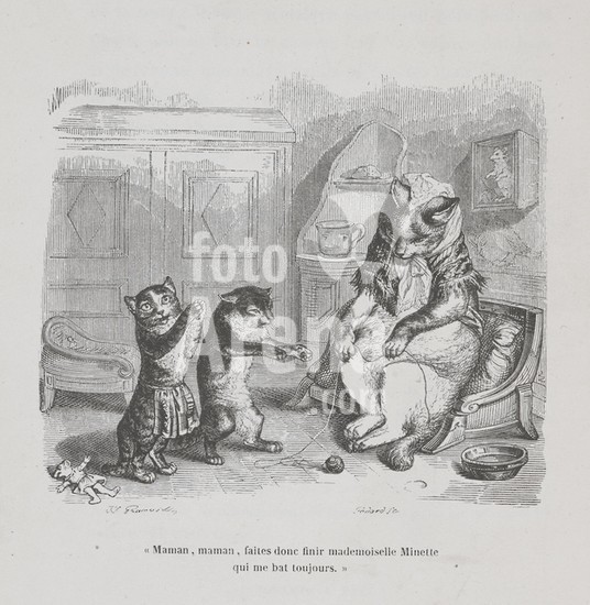 alb4058957 Maman, maman, faites donc finir mademoiselle Minette qui me bat toujours. Anthropomorphic image of cats. Peines de cœur d'une chatte anglaise.-Guide-âne à l'usage des animaux qui veulent parvenir aux honneurs.-Voyage d'un lion d'Afrique à Paris.-Les Amours de deux bêtes. In: Stahl (P. J.) pseud. Scènes de la vie privée des animaux ... Études de mœurs contemporaines publiées sous la direction de M. P. J. Stahl, avec la collaboration de Messieurs de Balzac, L. Baude, etc. 1842. 1842. Source: 1457.k.1. plate opposite page 173. Author: Balzac, Honoré de. GRANDVILLE.