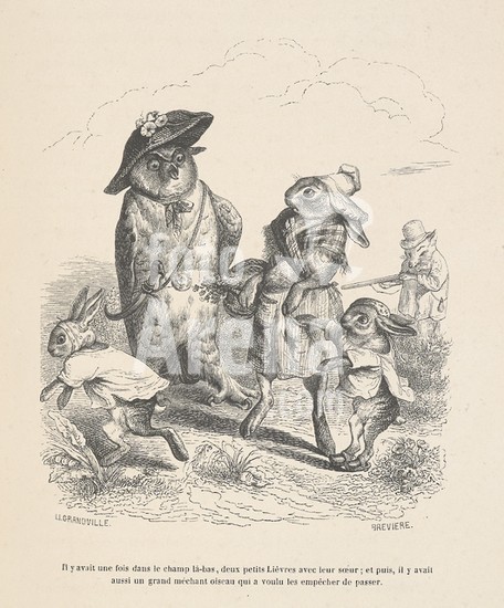 alb4059065 Il y avait une fois, dans le champ la-bas, deux petits lievres avec leur soeur; et puis, il y avait aussi un grand mechant oiseau qui a voulu les empecher de passer. Anthropomorphic image of rabbits and an owl. In the background a creature holds a shotgun. Peines de cœur d'une chatte anglaise.-Guide-âne à l'usage des animaux qui veulent parvenir aux honneurs.-Voyage d'un lion d'Afrique à Paris.-Les Amours de deux bêtes. In: Stahl (P. J.) pseud. Scènes de la vie privée des animaux ... Études de mœurs contemporaines publiées sous la direction de M. P. J. Stahl, avec la collaboration de Messieurs de Balzac, L. Baude, etc. 1842. Source: 1457.k.1 plate opposite page 40. Author: Balzac, Honoré de. GRANDVILLE.