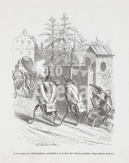 alb4059768 Leur innocent delassement consistait a se croire des heros pendant vingt-quatre heures. Anthropomorphic image of insects represented as soldiers. Peines de cœur d'une chatte anglaise.-Guide-âne à l'usage des animaux qui veulent parvenir aux honneurs.-Voyage d'un lion d'Afrique à Paris.-Les Amours de deux bêtes. In: Stahl (P. J.) pseud. Scènes de la vie privée des animaux ... Études de mœurs contemporaines publiées sous la direction de M. P. J. Stahl, avec la collaboration de Messieurs de Balzac, L. Baude, etc. 1842. 1842. Source: 1457.k.1. plate opposite page 142. Author: Balzac, Honoré de. GRANDVILLE.