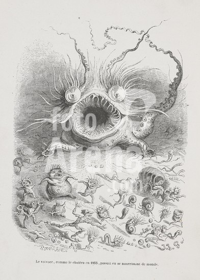 alb4060679 Le Volvace, comme le cholera en 1833, passait en se nourrissant de monde. Anthropomorphic image of a marine creature. Peines de cœur d'une chatte anglaise.-Guide-âne à l'usage des animaux qui veulent parvenir aux honneurs.-Voyage d'un lion d'Afrique à Paris.-Les Amours de deux bêtes. In: Stahl (P. J.) pseud. Scènes de la vie privée des animaux ... Études de mœurs contemporaines publiées sous la direction de M. P. J. Stahl, avec la collaboration de Messieurs de Balzac, L. Baude, etc. 1842. 1842. Source: 1457.k.1. plate opposite page 249. Author: Balzac, Honoré de. GRANDVILLE.