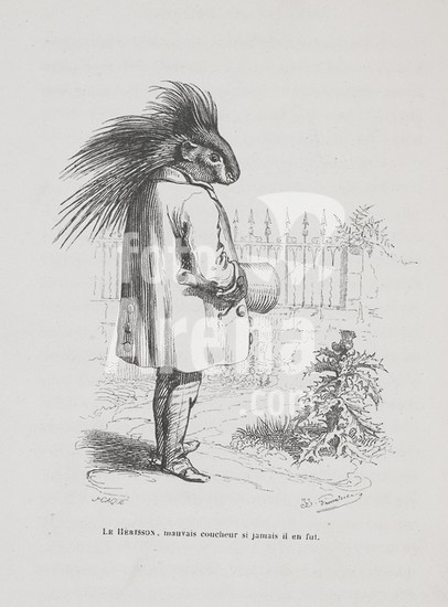 alb4063273 Le Herison, mauvais coucheur si jamais il en fut. Anthropomorphic image of a porcupine. Peines de cœur d'une chatte anglaise.-Guide-âne à l'usage des animaux qui veulent parvenir aux honneurs.-Voyage d'un lion d'Afrique à Paris.-Les Amours de deux bêtes. In: Stahl (P. J.) pseud. Scènes de la vie privée des animaux ... Études de mœurs contemporaines publiées sous la direction de M. P. J. Stahl, avec la collaboration de Messieurs de Balzac, L. Baude, etc. 1842. 1842. Source: 1457.k.1. plate opposite page 59. Author: Balzac, Honoré de.