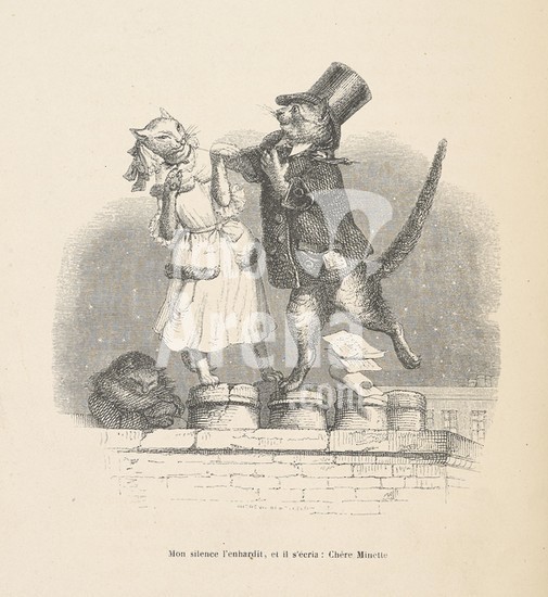 alb4063375 Mon silence l'enhardit, et il s'ecria, Chere Minette! Anthropomorphic image of two cats on a rooftop. Peines de cœur d'une chatte anglaise.-Guide-âne à l'usage des animaux qui veulent parvenir aux honneurs.-Voyage d'un lion d'Afrique à Paris.-Les Amours de deux bêtes. In: Stahl (P. J.) pseud. Scènes de la vie privée des animaux ... Études de mœurs contemporaines publiées sous la direction de M. P. J. Stahl, avec la collaboration de Messieurs de Balzac, L. Baude, etc. 1842. Source: 1457.k.1 plate opposite page 105. Author: Balzac, Honoré de. GRANDVILLE.