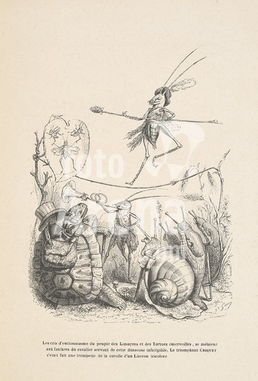 alb4066574 Les cris d'enthousiasme du peuple des Limacons et des Tortues emerveilles, se melaient aux fanfares du cavalier servant de cette danseuse infatigable, Le triomphant Criquet s'etait fait une trompette de la corolle d'un liseron tricolore. Anthropomorphic image of a tortoise and snails watching a Cricket performing on a high wire. Peines de cœur d'une chatte anglaise.-Guide-âne à l'usage des animaux qui veulent parvenir aux honneurs.-Voyage d'un lion d'Afrique à Paris.-Les Amours de deux bêtes. In: Stahl (P. J.) pseud. Scènes de la vie privée des animaux ... Études de mœurs contemporaines publiées sous la direction de M. P. J. Stahl, avec la collaboration de Messieurs de Balzac, L. Baude, etc. 1842. Source: 1457.k.1 plate opposite page 128. Author: Balzac, Honoré de. GRANDVILLE.