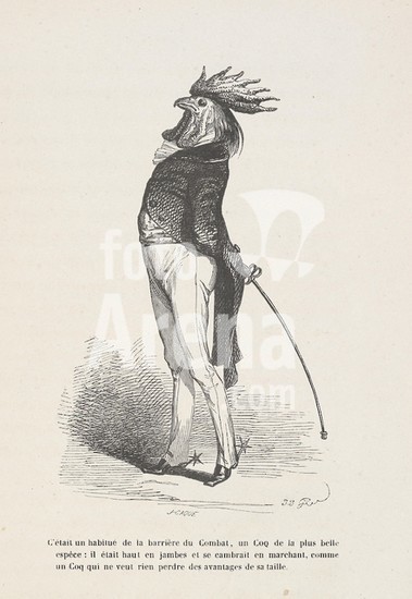 alb4067999 C'etait un habitue de la barriere du Combat, un Coq de la plus belle espece, il etait haut en jambes et se cambrait en marchant, comme un Coq qui ne veut rien perdre des avantages de sa taille. Anthropomorphic image of a chicken, wearing spurs and holding a sword or riding crop. Peines de cœur d'une chatte anglaise.-Guide-âne à l'usage des animaux qui veulent parvenir aux honneurs.-Voyage d'un lion d'Afrique à Paris.-Les Amours de deux bêtes. In: Stahl (P. J.) pseud. Scènes de la vie privée des animaux ... Études de mœurs contemporaines publiées sous la direction de M. P. J. Stahl, avec la collaboration de Messieurs de Balzac, L. Baude, etc. 1842. Source: 1457.k.1 plate opposite page 66. Author: Balzac, Honoré de. GRANDVILLE.