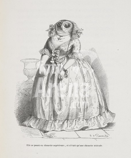 alb4068908 Elle se posait en chouette superieure, et n'etait qu'une chouette ridicule. Anthropomorphic image of an owl wearing a dress. Peines de cœur d'une chatte anglaise.-Guide-âne à l'usage des animaux qui veulent parvenir aux honneurs.-Voyage d'un lion d'Afrique à Paris.-Les Amours de deux bêtes. In: Stahl (P. J.) pseud. Scènes de la vie privée des animaux ... Études de mœurs contemporaines publiées sous la direction de M. P. J. Stahl, avec la collaboration de Messieurs de Balzac, L. Baude, etc. 1842. 1842. Source: 1457.k.1. plate opposite page 342. Author: Balzac, Honoré de.