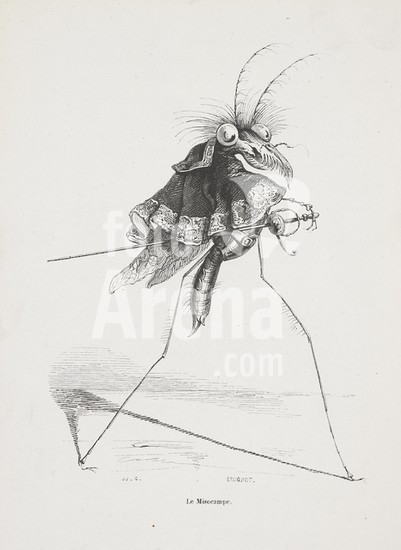 alb4069069 Le misocampe.' Anthropomorphic image of a mosquito, holding a sword. Peines de cœur d'une chatte anglaise.-Guide-âne à l'usage des animaux qui veulent parvenir aux honneurs.-Voyage d'un lion d'Afrique à Paris.-Les Amours de deux bêtes. In: Stahl (P. J.) pseud. Scènes de la vie privée des animaux ... Études de mœurs contemporaines publiées sous la direction de M. P. J. Stahl, avec la collaboration de Messieurs de Balzac, L. Baude, etc. 1842. 1842. Source: 1457.k.1. plate opposite page 269. Author: Balzac, Honoré de. GRANDVILLE.