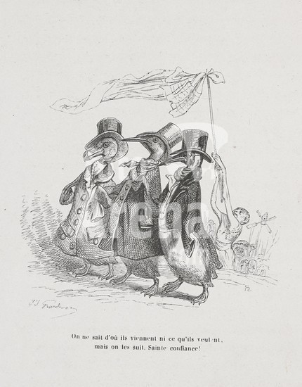 alb4070161 On ne sait d'ou ils viennent ni ce qu'ils veulent, mais on les suit Sainte confiance! Anthropomorphic image of three ducks dressed in coats and top hats. Peines de cœur d'une chatte anglaise.-Guide-âne à l'usage des animaux qui veulent parvenir aux honneurs.-Voyage d'un lion d'Afrique à Paris.-Les Amours de deux bêtes. In: Stahl (P. J.) pseud. Scènes de la vie privée des animaux ... Études de mœurs contemporaines publiées sous la direction de M. P. J. Stahl, avec la collaboration de Messieurs de Balzac, L. Baude, etc. 1842. 1842. Source: 1457.k.1. plate opposite page 25. Author: Balzac, Honoré de.