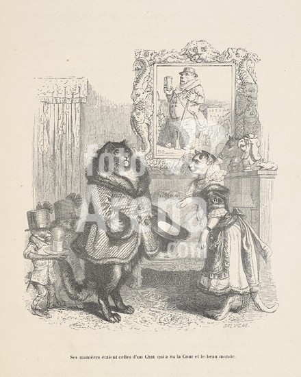 alb4075008 Ses manieres etaient celles d'un chat qui a vu la cour et le beau monde. Anthropomorphic image of cats. Peines de cœur d'une chatte anglaise.-Guide-âne à l'usage des animaux qui veulent parvenir aux honneurs.-Voyage d'un lion d'Afrique à Paris.-Les Amours de deux bêtes. In: Stahl (P. J.) pseud. Scènes de la vie privée des animaux ... Études de mœurs contemporaines publiées sous la direction de M. P. J. Stahl, avec la collaboration de Messieurs de Balzac, L. Baude, etc. 1842. Source: 1457.k.1 plate opposite page 98. Author: Balzac, Honoré de. GRANDVILLE.