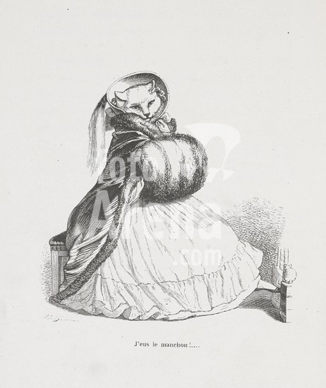 alb4077090 J'eus le Manchon! Anthropomorphic image of a cat in dress, holding a muff. Peines de cœur d'une chatte anglaise.-Guide-âne à l'usage des animaux qui veulent parvenir aux honneurs.-Voyage d'un lion d'Afrique à Paris.-Les Amours de deux bêtes. In: Stahl (P. J.) pseud. Scènes de la vie privée des animaux ... Études de mœurs contemporaines publiées sous la direction de M. P. J. Stahl, avec la collaboration de Messieurs de Balzac, L. Baude, etc. 1842. 1842. Source: 1457.k.1. plate opposite page 179. Author: Balzac, Honoré de. GRANDVILLE.