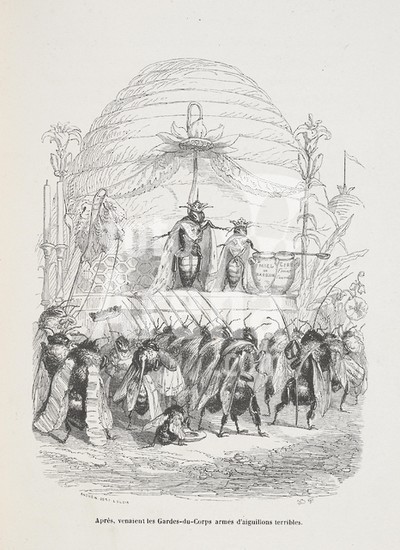 alb4077913 Apres venaient les gardes-du-corps armes d'aiguillons terribles. Anthropomorphic image of ants as soldiers. Peines de cœur d'une chatte anglaise.-Guide-âne à l'usage des animaux qui veulent parvenir aux honneurs.-Voyage d'un lion d'Afrique à Paris.-Les Amours de deux bêtes. In: Stahl (P. J.) pseud. Scènes de la vie privée des animaux ... Études de mœurs contemporaines publiées sous la direction de M. P. J. Stahl, avec la collaboration de Messieurs de Balzac, L. Baude, etc. 1842. Source: 1457.k.1 plate opposite page 244. Author: Balzac, Honoré de. GRANDVILLE.
