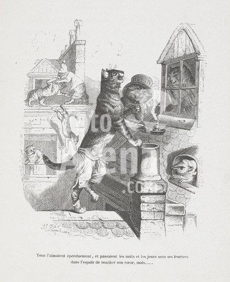 alb4078184 Tous l'aimaient eperdument; et passaient les nuits et les jours sous ses fenetres, dans l'espoir de toucher son coeur; mais. Anthropomorphic image of cats on a rooftop. Peines de cœur d'une chatte anglaise.-Guide-âne à l'usage des animaux qui veulent parvenir aux honneurs.-Voyage d'un lion d'Afrique à Paris.-Les Amours de deux bêtes. In: Stahl (P. J.) pseud. Scènes de la vie privée des animaux ... Études de mœurs contemporaines publiées sous la direction de M. P. J. Stahl, avec la collaboration de Messieurs de Balzac, L. Baude, etc. 1842. 1842. Source: 1457.k.1. plate opposite page 190. Author: Balzac, Honoré de. GRANDVILLE.