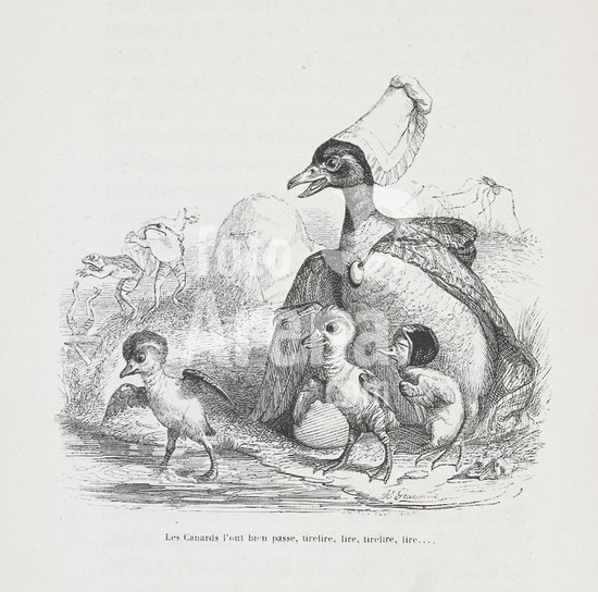 alb4078844 Les Canards l'ont bien passee, tirelire, lire, tirelire, lire. Anthropomorphic image of Ducks. Peines de cœur d'une chatte anglaise.-Guide-âne à l'usage des animaux qui veulent parvenir aux honneurs.-Voyage d'un lion d'Afrique à Paris.-Les Amours de deux bêtes. In: Stahl (P. J.) pseud. Scènes de la vie privée des animaux ... Études de mœurs contemporaines publiées sous la direction de M. P. J. Stahl, avec la collaboration de Messieurs de Balzac, L. Baude, etc. 1842. 1842. Source: 1457.k.1. plate opposite page 63. Author: Balzac, Honoré de.