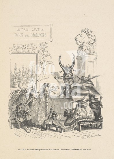 alb4079060 Le mari doit protection a sa femme, la femme obeissance a son mari. Anthropomorphic image of insects in a civil court. A beetle reading marriage vows. Peines de cœur d'une chatte anglaise.-Guide-âne à l'usage des animaux qui veulent parvenir aux honneurs.-Voyage d'un lion d'Afrique à Paris.-Les Amours de deux bêtes. In: Stahl (P. J.) pseud. Scènes de la vie privée des animaux ... Études de mœurs contemporaines publiées sous la direction de M. P. J. Stahl, avec la collaboration de Messieurs de Balzac, L. Baude, etc. 1842. Source: 1457.k.1 plate opposite page 126. Author: Balzac, Honoré de. GRANDVILLE.