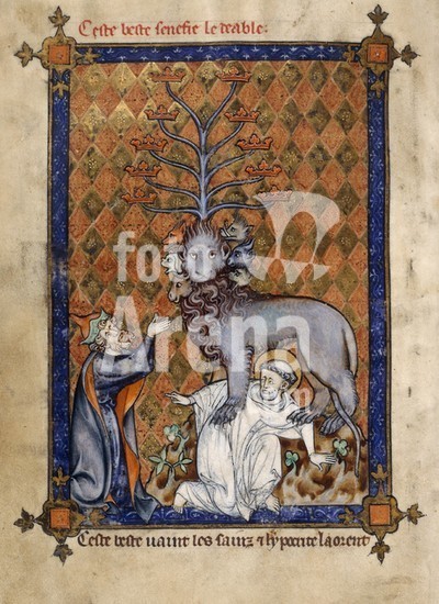 alb4079179 Beast with saint and hypocrite. La Somme le Roy. France (Paris); end of 13th century. (Whole folio) The Beast of the Apocalypse, trampling a saint and adored by a kneeling hypocrite. Image taken from La Somme le Roy. Originally published/produced in France (Paris); end of 13th century. . Source: Add. 54180, f.14v. Language: French. Author: Laurent, Frère. Maître Honoré.