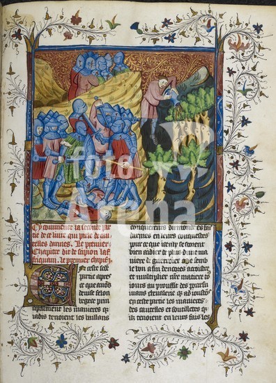 alb4081222 Miniature of a battle between fully armed men on foot, with, on the right, a man pouring blood out of a jug onto a stand of trees; probably refers to the bloodsoaked 'Tree of Battles' of Honoré Bovet's L'Arbre des batailles . Le livre des faits d'armes et de chevalerie. England, S. E. (London); 1434. Source: Harley 4605, f.41. Language: French. Author: Pisan, Christine de.