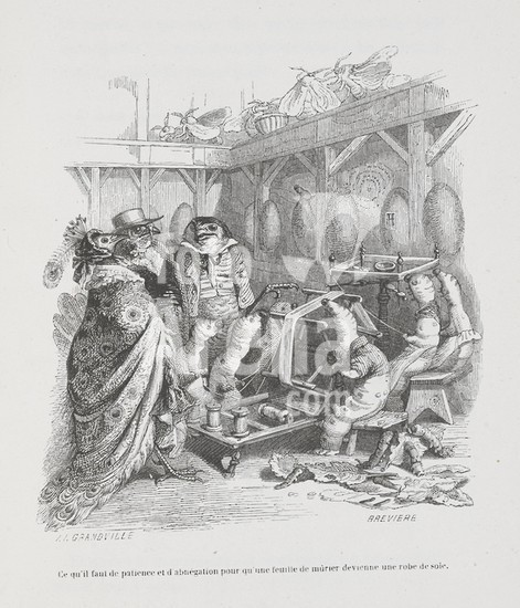 alb4081716 Ce qu'il faut de patience et d'abnegation pour qu'une feuille de murier devienne une robe de soie. Anthropomorphic image of birds and silkworms that are operating a weaving machine. Peines de cœur d'une chatte anglaise.-Guide-âne à l'usage des animaux qui veulent parvenir aux honneurs.-Voyage d'un lion d'Afrique à Paris.-Les Amours de deux bêtes. In: Stahl (P. J.) pseud. Scènes de la vie privée des animaux ... Études de mœurs contemporaines publiées sous la direction de M. P. J. Stahl, avec la collaboration de Messieurs de Balzac, L. Baude, etc. 1842. 1842. Source: 1457.k.1. plate opposite page 378. Author: Balzac, Honoré de. GRANDVILLE.