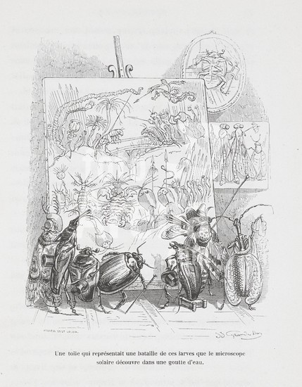 alb4081860 Une toile qui representait une bataille de ces larves que le microscope solaire decouvre dans une goutte d'eau. Anthropomorphic image of insects looking at a sketch. Peines de cœur d'une chatte anglaise.-Guide-âne à l'usage des animaux qui veulent parvenir aux honneurs.-Voyage d'un lion d'Afrique à Paris.-Les Amours de deux bêtes. In: Stahl (P. J.) pseud. Scènes de la vie privée des animaux ... Études de mœurs contemporaines publiées sous la direction de M. P. J. Stahl, avec la collaboration de Messieurs de Balzac, L. Baude, etc. 1842. 1842. Source: 1457.k.1. plate opposite page 130. Author: Balzac, Honoré de. GRANDVILLE.