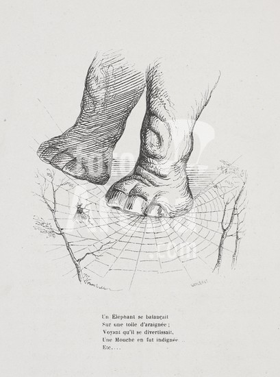 alb4083338 Un Elephant se balancait, Sur une toile d'araignee; Voyant qu'il se divertissait, Une Mouche en fut indignee, Etc ... The foot of an elephant in a spiders web. Peines de cœur d'une chatte anglaise.-Guide-âne à l'usage des animaux qui veulent parvenir aux honneurs.-Voyage d'un lion d'Afrique à Paris.-Les Amours de deux bêtes. In: Stahl (P. J.) pseud. Scènes de la vie privée des animaux ... Études de mœurs contemporaines publiées sous la direction de M. P. J. Stahl, avec la collaboration de Messieurs de Balzac, L. Baude, etc. 1842. 1842. Source: 1457.k.1. plate opposite page 31. Author: Balzac, Honoré de.
