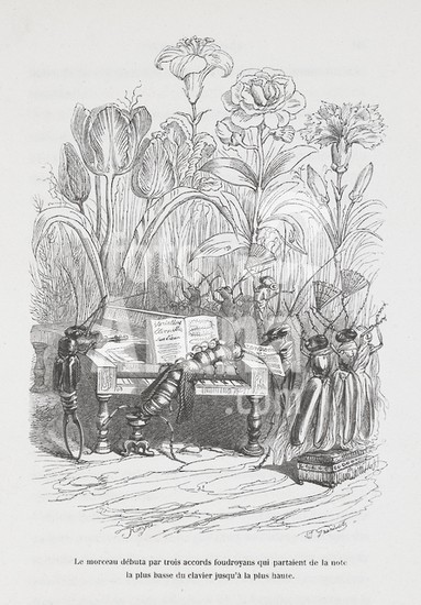 alb4083748 Le morceau debuta par trois accords foudroyans qui partaient de la note la plus basse du clavier jusqu'a la plus haute. Anthropomorphic image of insects gathered around a piano. Peines de cœur d'une chatte anglaise.-Guide-âne à l'usage des animaux qui veulent parvenir aux honneurs.-Voyage d'un lion d'Afrique à Paris.-Les Amours de deux bêtes. In: Stahl (P. J.) pseud. Scènes de la vie privée des animaux ... Études de mœurs contemporaines publiées sous la direction de M. P. J. Stahl, avec la collaboration de Messieurs de Balzac, L. Baude, etc. 1842. 1842. Source: 1457.k.1. plate opposite page 124. Author: Balzac, Honoré de. GRANDVILLE.