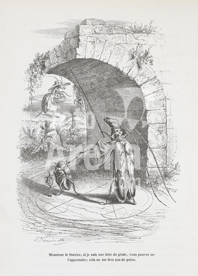 alb4085509 Monsieur le Sorcier, si je suis une bete de genie, vous pouvez me l'apprendre; cela ne me fera pas de peine. Anthropomorphic image of insects measuring the height of a bridge. Peines de cœur d'une chatte anglaise.-Guide-âne à l'usage des animaux qui veulent parvenir aux honneurs.-Voyage d'un lion d'Afrique à Paris.-Les Amours de deux bêtes. In: Stahl (P. J.) pseud. Scènes de la vie privée des animaux ... Études de mœurs contemporaines publiées sous la direction de M. P. J. Stahl, avec la collaboration de Messieurs de Balzac, L. Baude, etc. 1842. 1842. Source: 1457.k.1. plate opposite page 115. Author: Balzac, Honoré de. GRANDVILLE.